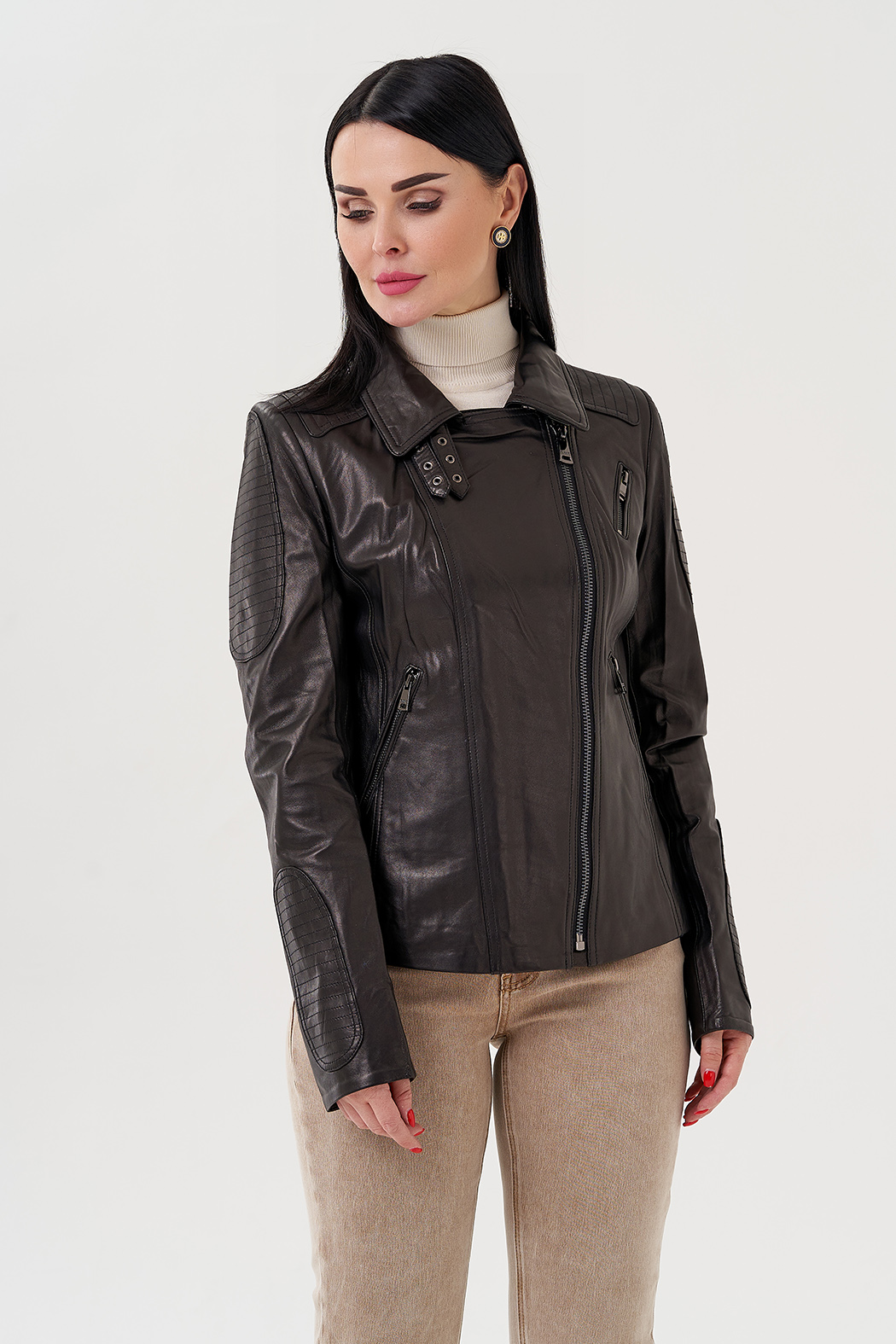 Куртка из натуральной кожи - изящная и универсальная вещь в гардеробе. Выполнена в черном цвете, что делает ее практичной. Модель приталенная, что делает ее более женственной. Застегивается на молнию. Воротник можно поднять и закрепить на ремешки. По бокам есть карманы на молнии. Куртка стилизована накладными вставкамина рукавах и плечах.