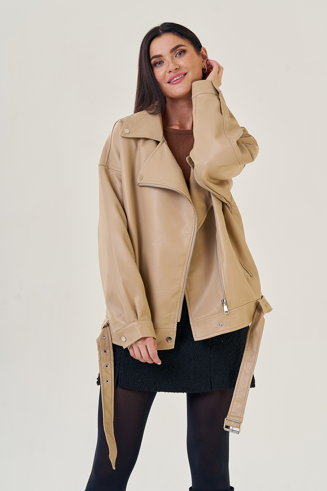 Бежевая куртка в стиле оверсайз точно попадет вам в сердце! Светло-бежевый цвет позволит подбирать к куртке разные образы. Материал эко кожи устойчив к холодам и повреждениям. Модель застегивается на молнию и кнопки. Имеется ремень и карманы на молнии. Рукава с манжетами на кнопках. Фасон оверсайз и спущенные плечи добавят комфорт.
