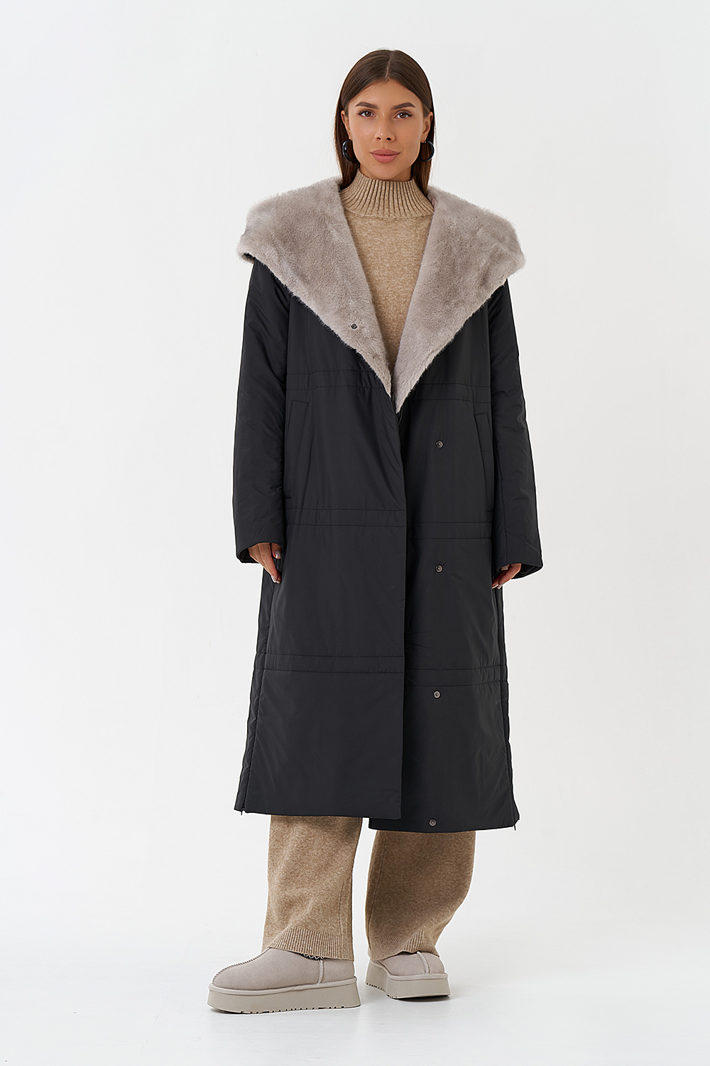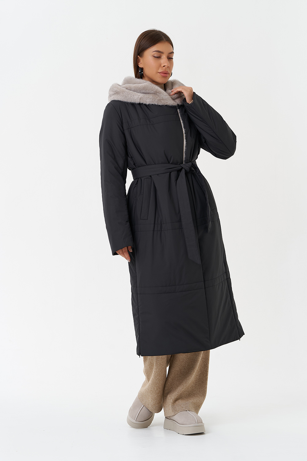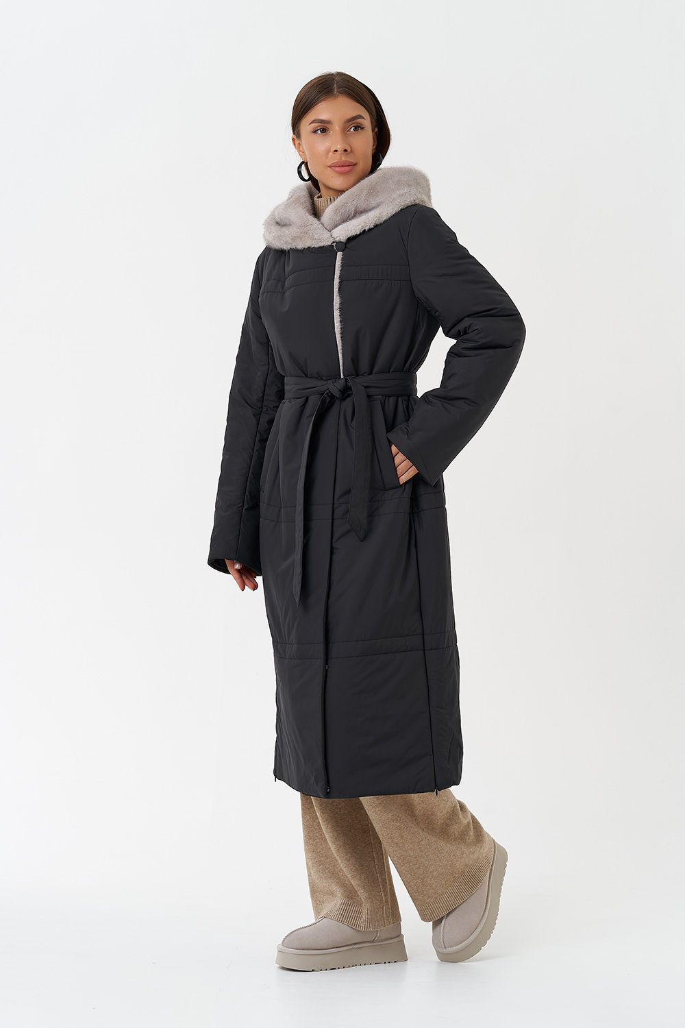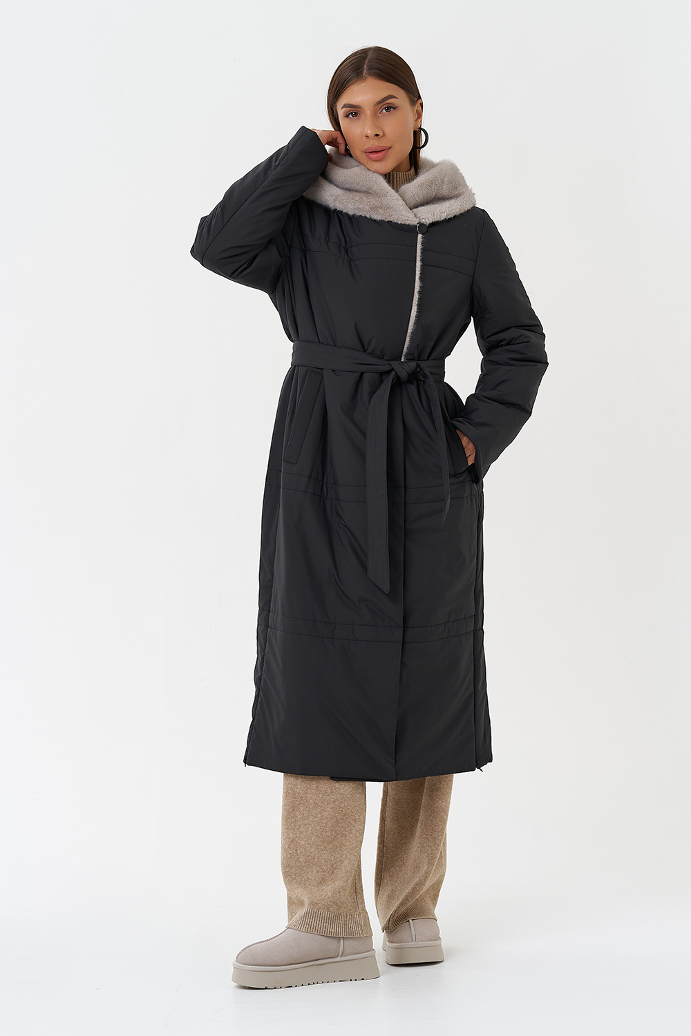 Крой воротника - капюшон, отделка эко мех под норку