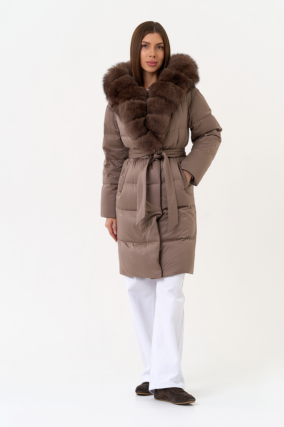 Крой воротника - капюшон, отделка мех песца