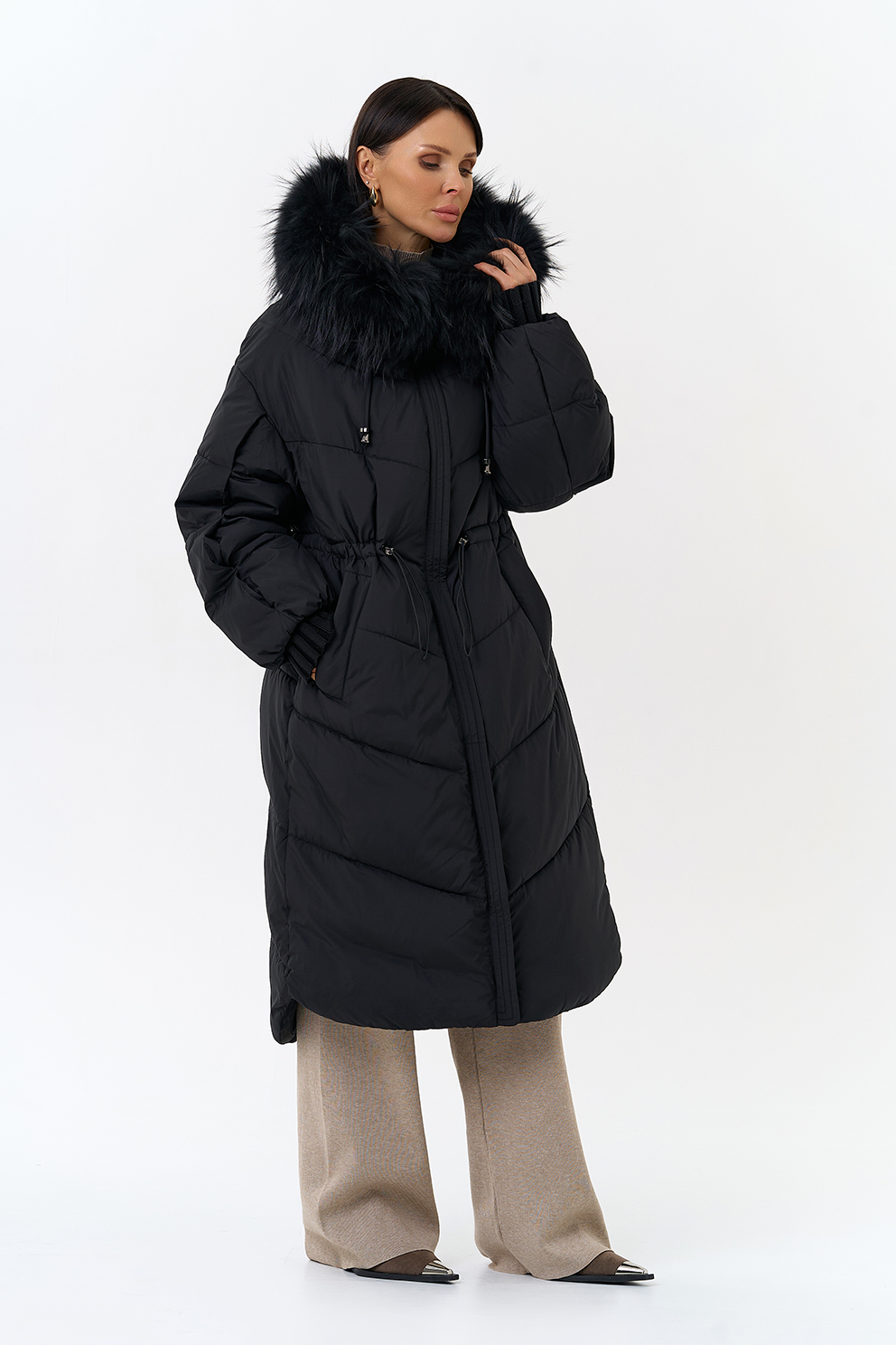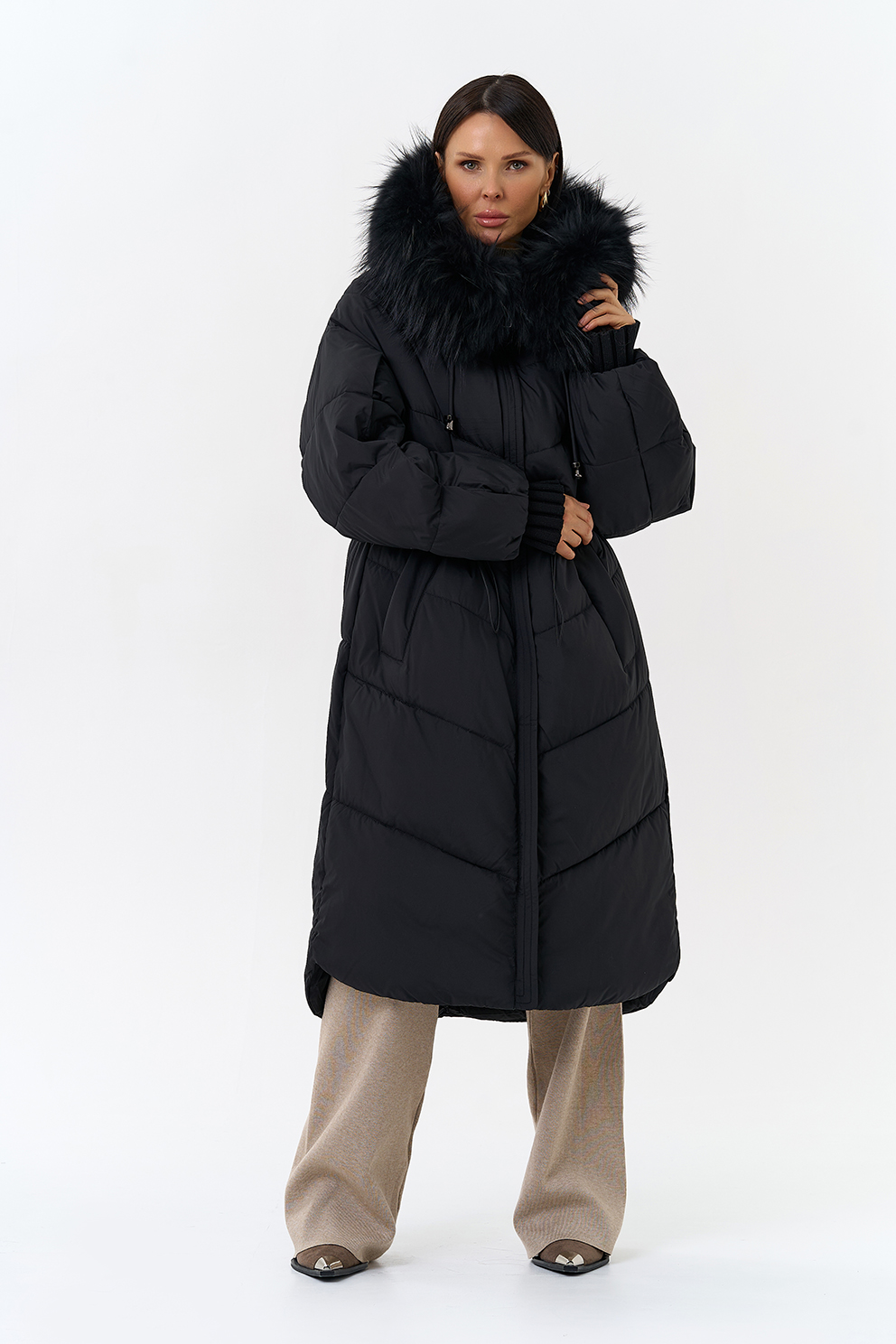 Крой воротника - капюшон, отделка чернобурка
