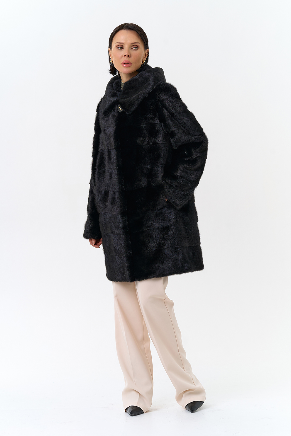 Шуба поперечной раскладки в черном цвете из меха норки.